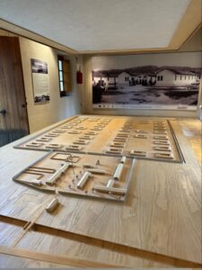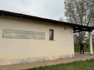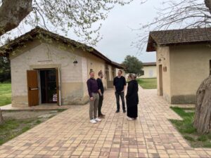 Nestled in a beautiful green valley, surrounded by dramatic mountains, our journey into the past began with an exploration of Camp Ferramonti and the stories within it, waiting to be shared by us. On arrival we were greeted by Sarah, a dedicated volunteer, who gave us a guided tour of the site. We began our tour at the old commanders’ area, starting with the wooden scale model. Accompanied by well-preserved documents and objects in displays and reconstructed beds, many photographs and artworks served as windows into the souls and stories of those who once lived here. Kasper, with his eye for detail, embarked on a mission to plan how to capture the essence of the buildings. His work, aimed at scanning both the interiors and exteriors, is crucial to our project of digitally reconstructing the camp’s architecture and offering future generations a glimpse of its past.